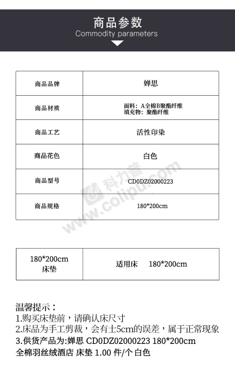 婵思 CHANSI 全棉羽丝绒酒店 床垫 CD0DZ02000223 180*200cm (白色) (单位:个)